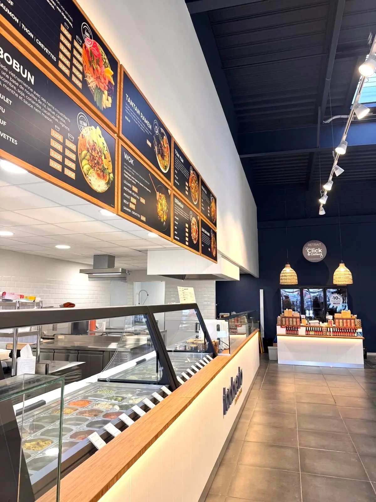 🍜 Plats cuisinés : Pad thaï, poulet curry jaune, crevettes curry rouge, bœuf basilic thaï, saumon teriyaki…
